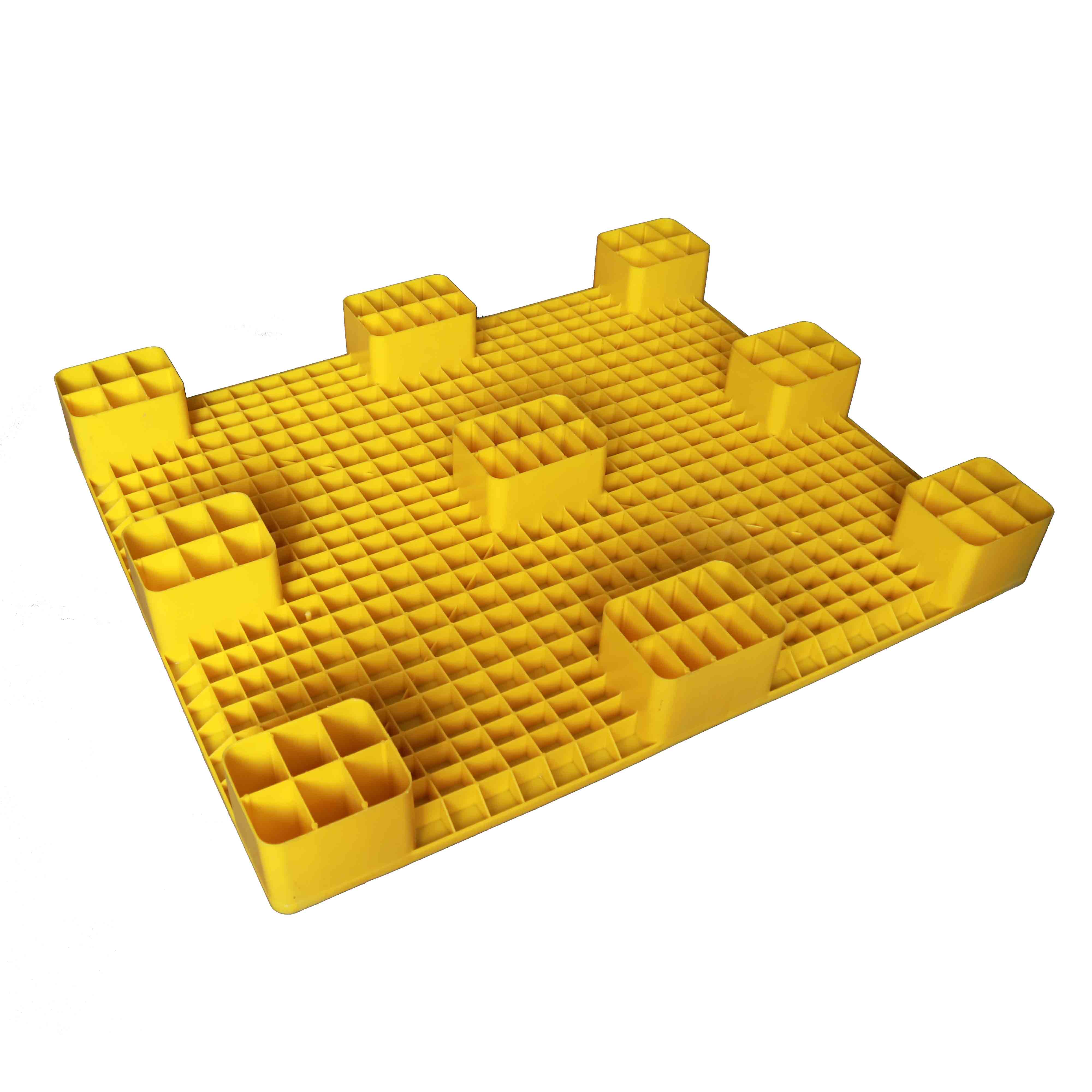1210九腳平板塑料托盤規(guī)格是1200*1000*150mm,動載1T,靜載3T,采用抗沖擊高密度聚乙烯HDPE,適合平地使用。
